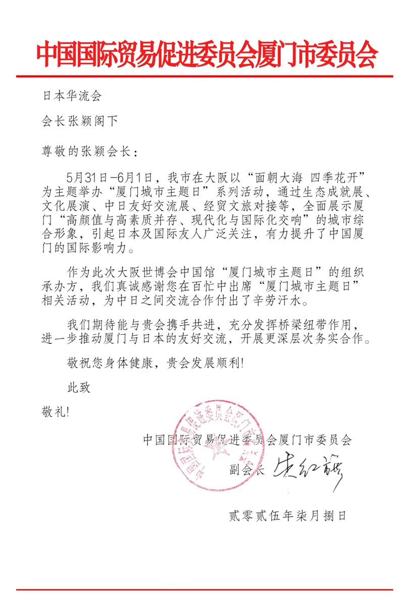 5月30日至6月1日 日本华流会与日中文化振兴事业团举办了第二届华流文化节展商会。 主题是配合大阪世博会福建周,厦门城市主题日搭建中日商文旅对接平台。 本次展商会有22家中日企业共同出展。本次的主题是【大健康与未来社会】。 第二届华流文化节展商会开幕式60余名嘉宾展商和会员参加,两天参展人员计600余名。 三天内日本华流会组织会员等参加了福建周,福州日,厦门日以及相关的经贸交流会,近铁展销会等活动。